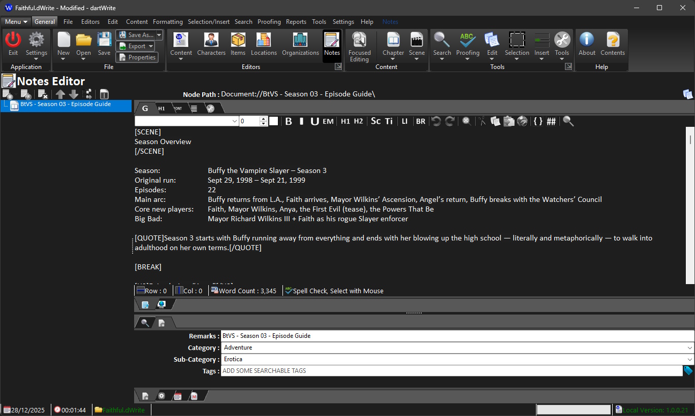 dartWrite is a Scene based novel writing software. It's currently in early development, with a beta release to the public soon. There is still a long way to go until it's ready. But I wanted to let you know this is coming, and get feedback and your wishes and thoughts. I'm currently running and collating that sort of thing on the Discord support thread for the application. Please go there if you have any ideas, or features you'd like to see in the application. I'm using demScribble as a basic framework but it's Scene based, meaning that each scene is authored seperately, rather than Chapter based like demScribble.